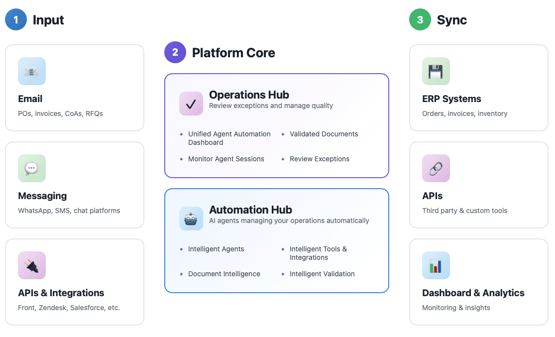 Automate inboxes and enterprise documents—POs, invoices, BOLs, COAs, SDS—across your ERP and helpdesk. Governance built-in. Go live fast with pre-built agent and document extractor templates.