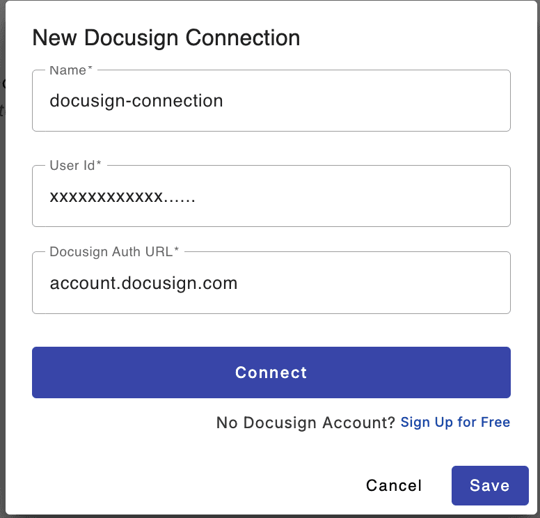 Give your connection a memorable name (e.g., "DocuSign-Connection").User ID: