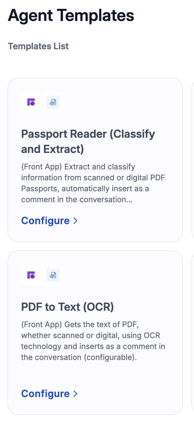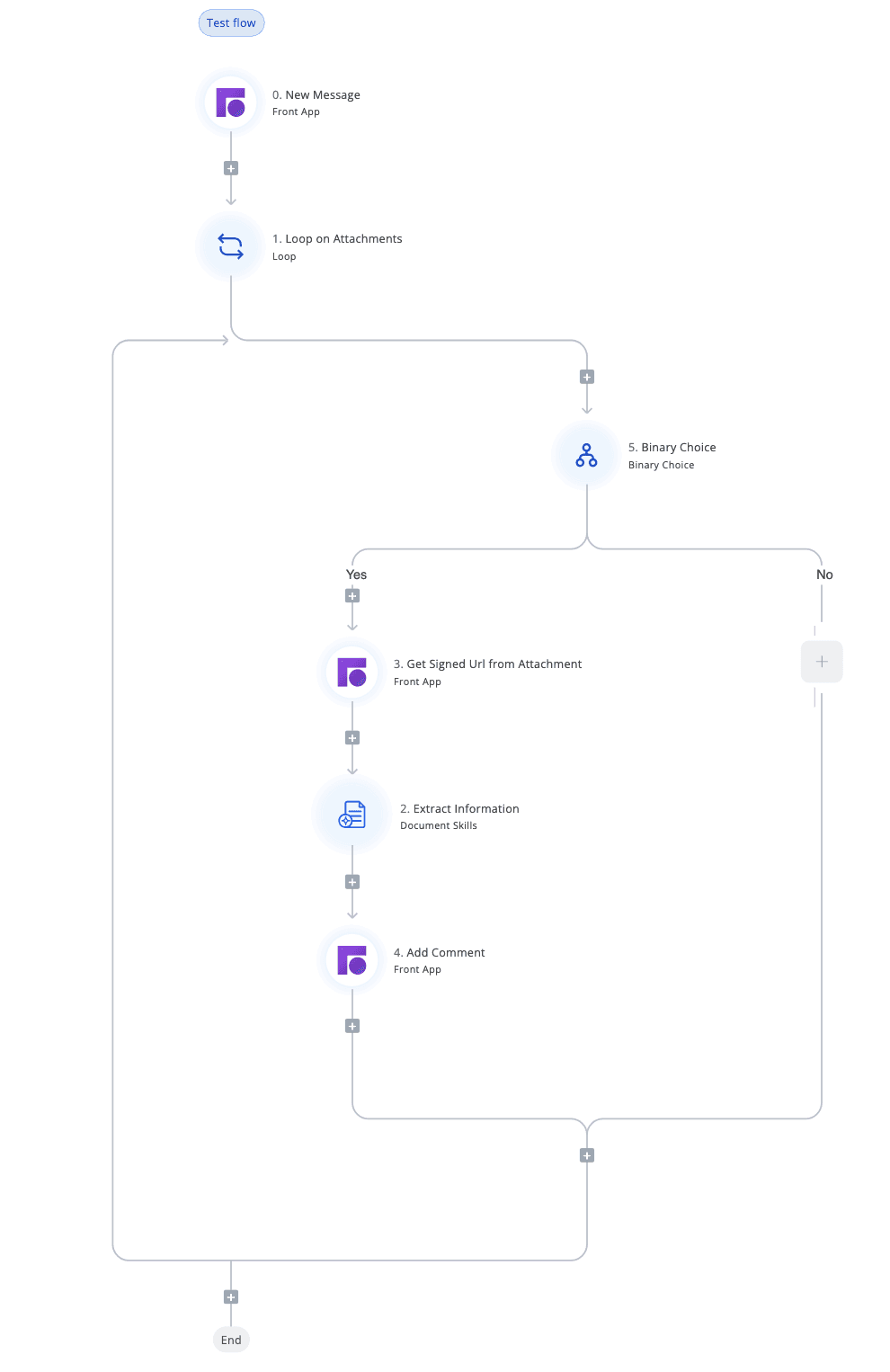 The sample agent flow for PDF to Text (OCR) which extracts the text of a PDF attachment and adds it as a comment in Front App (triggered by arrival of a new email/message in a Front App inbox).