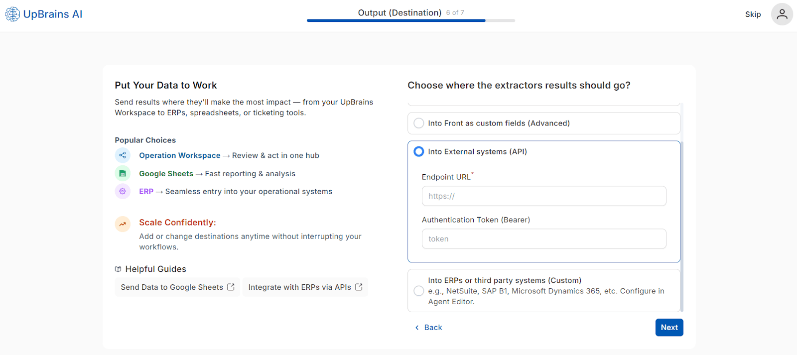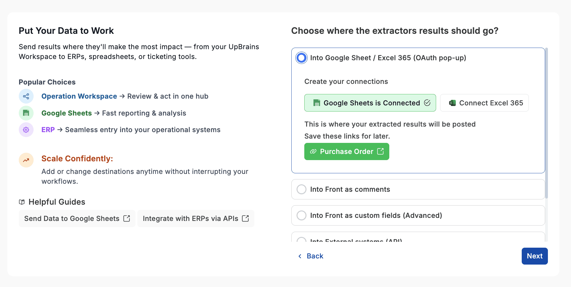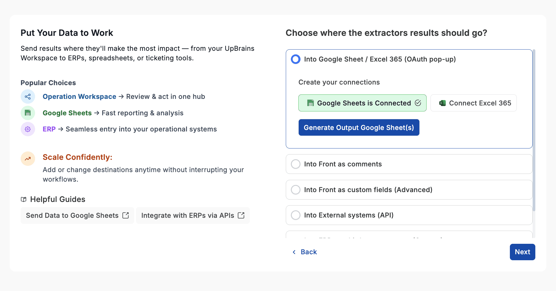 Start with Google Sheets for instant visibility and quick validation of your extracted data. Once your setup is verified, expand to API or ERP integrations for full automation.