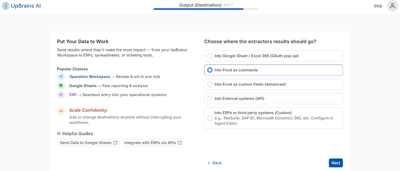 Post the extraction results as comments inside your Front inbox or Zendesk ticking system (depending on which one you have connected). Ideal for teams who collaborate within email threads or ticket discussions to have the results be posted as comments.