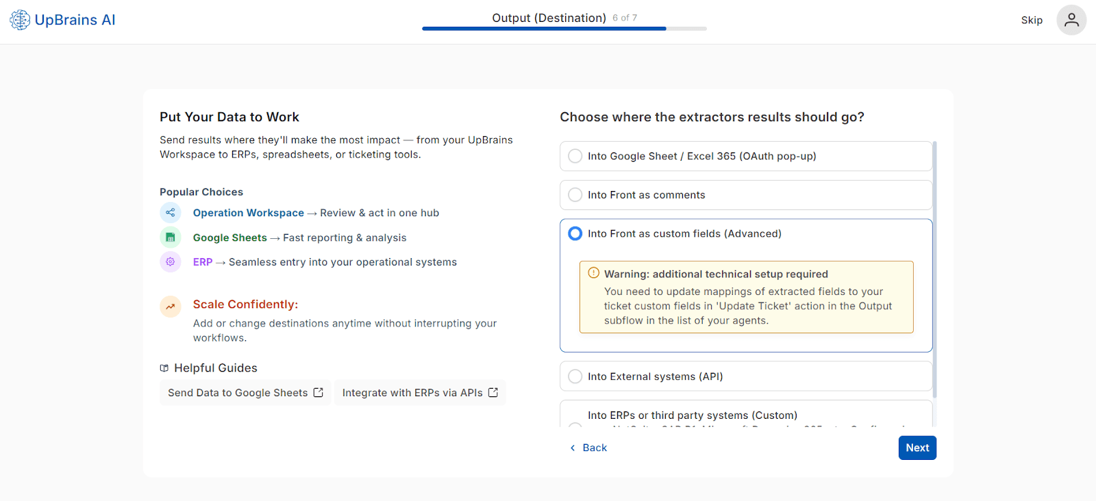 Map extracted data into custom ticket fields inside Front or Zendesk.