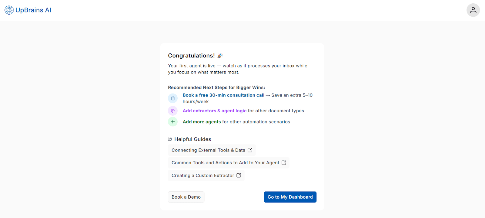 You are given a free trial subscription for 14 days! Feel free to explore the dashboard and test your AI agent by sending messages that will trigger your AI agent. As next step, we recommend booking a call with us to see how you can get more out of your trial period through the booking page at https://upbrains.ai/book